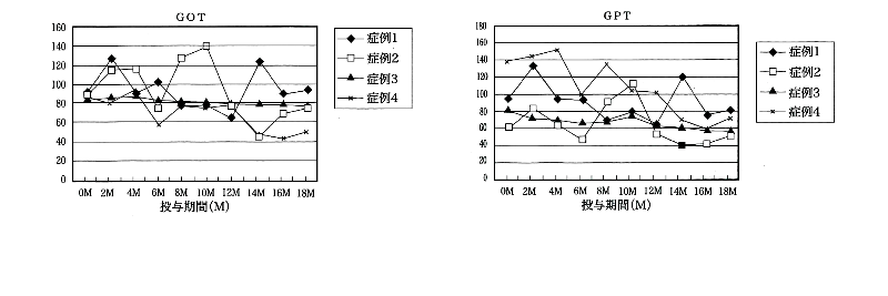 今回の症例では、12ヶ月を超える長期内服後に改善傾向が現われたが、1日の投与量が少ないためか、C型慢性肝炎に使用した場合の特徴なのか判定し得ないが、肝機能改善の現われていない2例においてもさらに長期内服による改善の可能性があると考えられた。