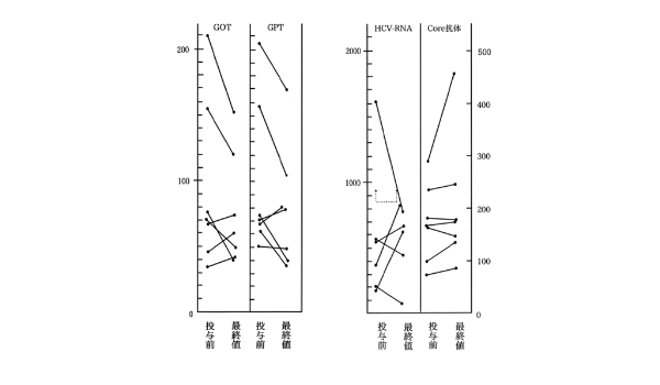 以上の結果から、LEMは肝炎の抑制、肝機能の改善に有用であると考えられた。また、LEMによるウイルス抑制の可能性も示唆され、C型肝炎に対するLEMの治療効果は緩徐ではあるが有用性が高いものと考えられた。